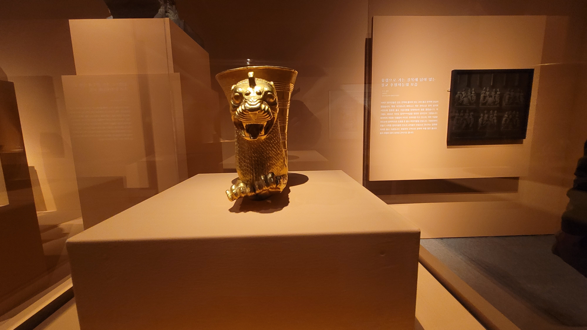 기원전 6세기말, 페르시아 제국의 다리우스 1세는 인더스강을 차지하고 인도 북서부지역에 페르시아의 문명을 알렸습니다. 이 잔은 기원전 5세기에 페르시아에서 만들어졌습니다. 뿔잔을 장식하는 전설 속 동물의 특징은 인도의 조각상에서도 찾을 수 있습니다. 페르시아의 문명이 인도에 널리 퍼졌다는 증거입니다.