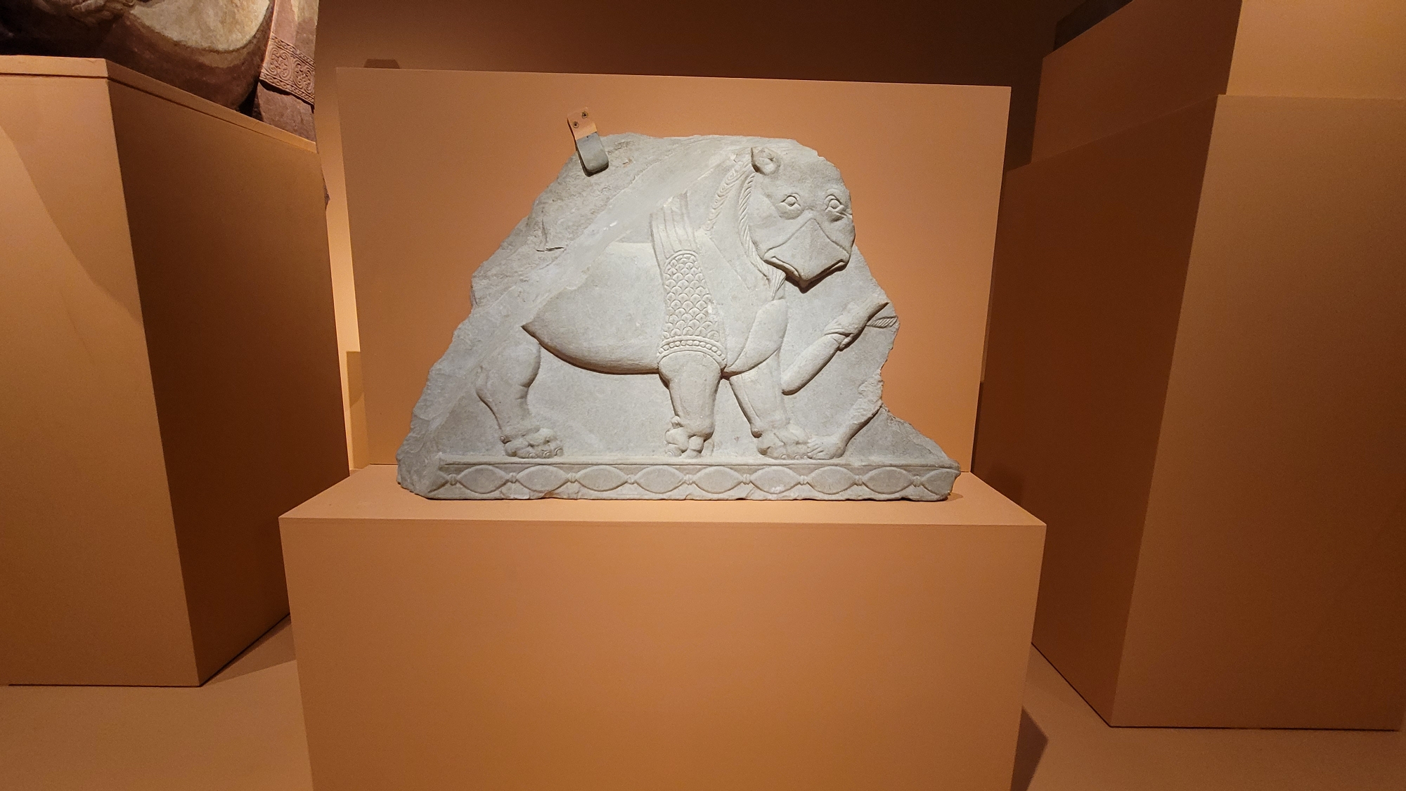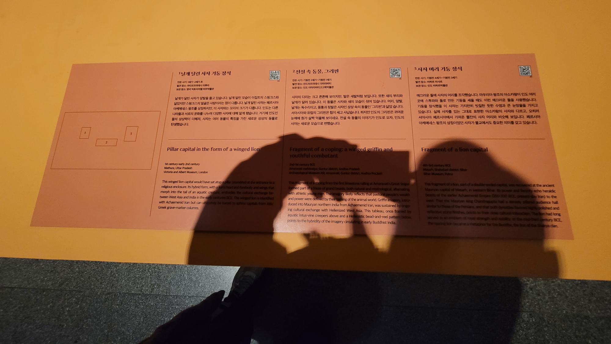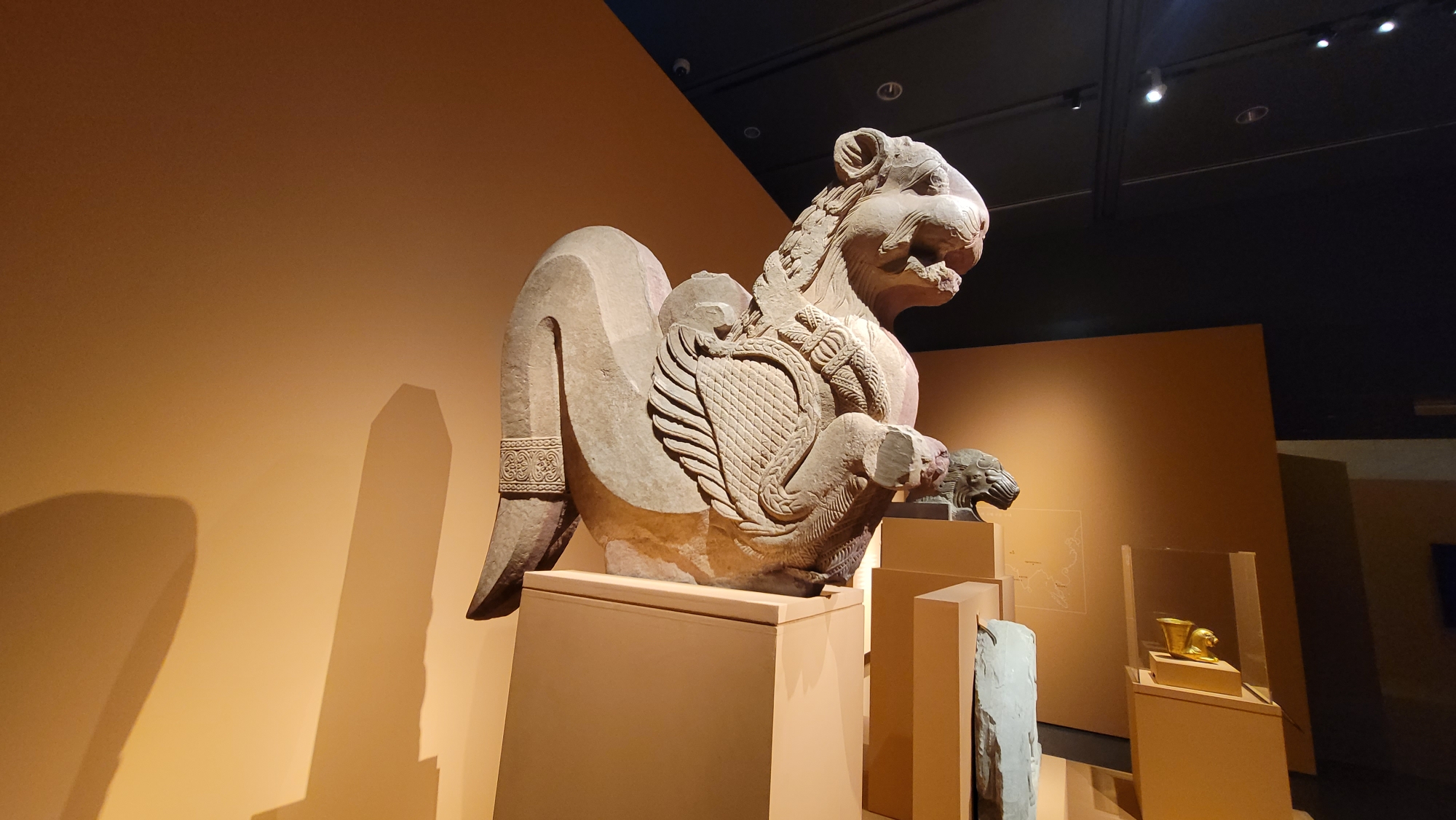 날개가 달린 사자가 앞발을 들고 있습니다. 날개 달린 모습이 이집트의 스핑크스와 닮았지만 스핑크스의 얼굴은 사람이라는 점이 다릅니다. 날개 달린 사자는 페르시아 아케메네스 왕조를 상징하지만, 이 사자와는 꼬리의 크기가 다릅니다. 인도는 다른 나라들과 서로의 문화를 나누며 다양한 사자에 대해 알게 됐습니다. 거기에 인도인들의 상상력이 더해져, 사자는 여러 동물의 특징을 가진 새로운 상상의 동물로 탄생했습니다.