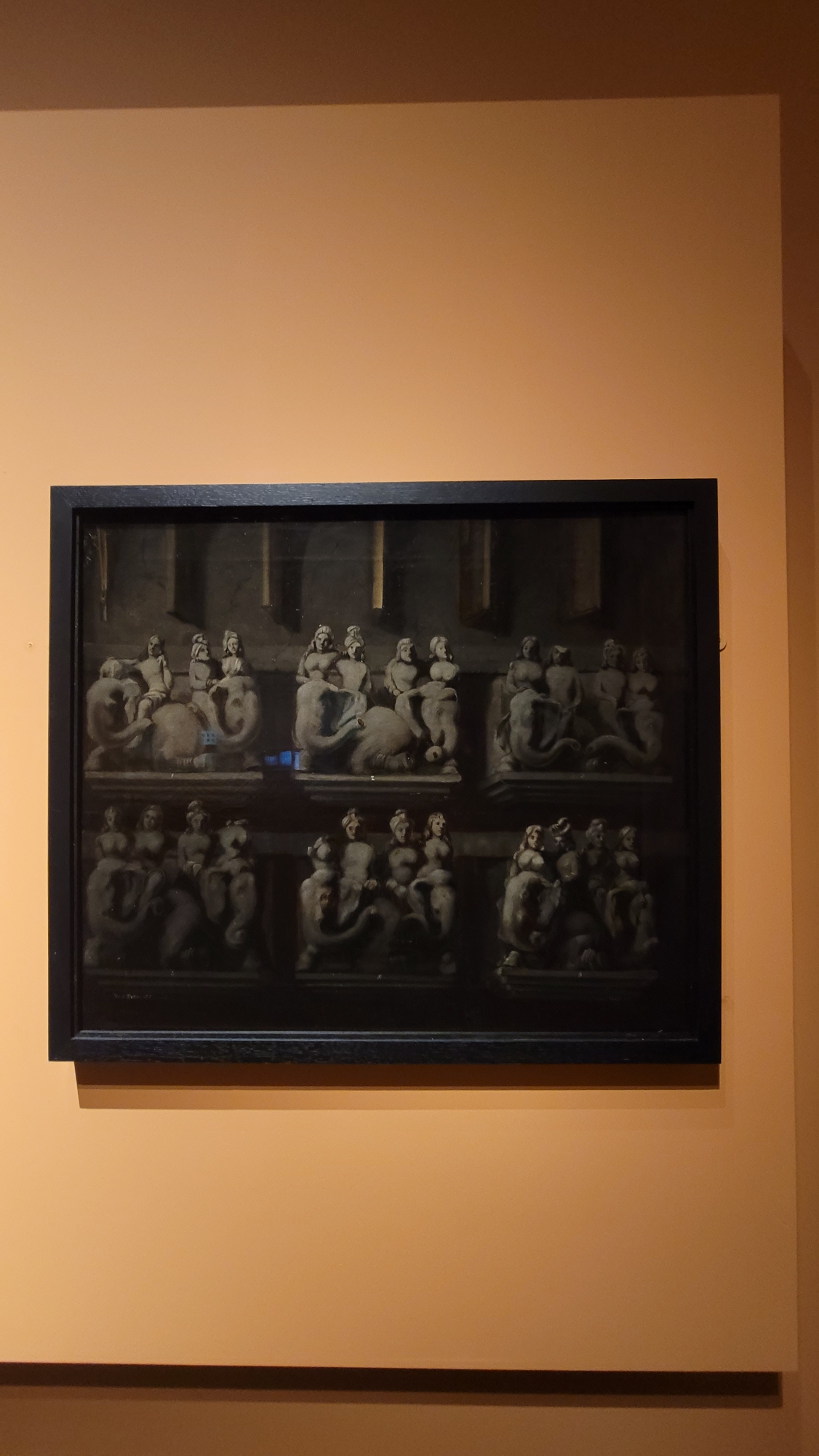 사자의 다리는 크고 튼튼해 보이지만, 발은 새발처럼 보입니다. 또한 새의 부리와 날개가 달려 있습니다. 이 동물은 사자와 새의 모습이 섞여 있습니다. 머리, 앞발, 날개는 독수리이고 몸통과 뒷발은 사자인 상상 속의 동물인 '그리핀' 과 닮았습니다. 서아시아와 유럽의 그리핀은 힘이 세고 사납습니다. 하지만 인도의 그리핀은 귀여운 눈매에 뭔가 살짝 억울해 보이네요. 전설 속 동물의 이야기가 인도로 오자, 인도의 사자는 새로운 모습으로 변했습니다.