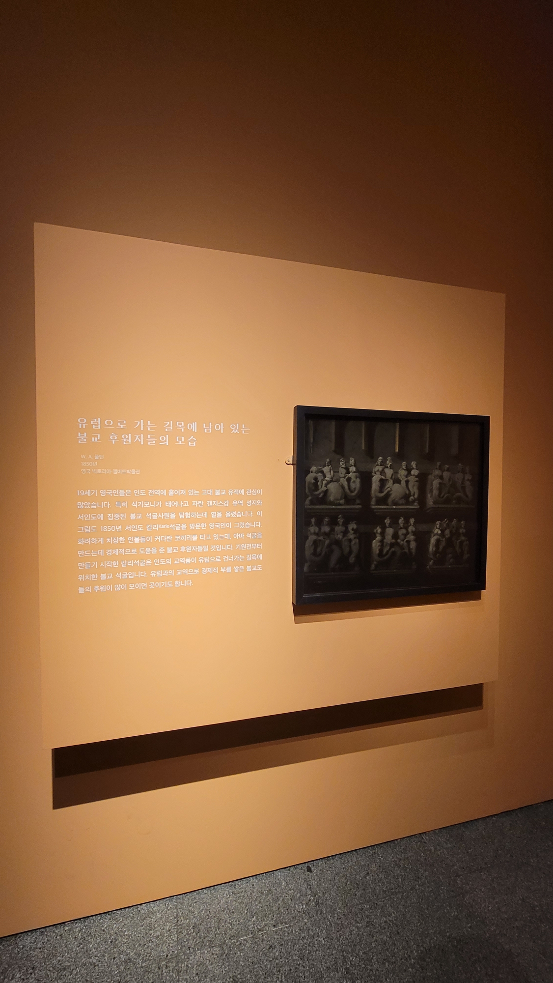 19세기 영국인들은 인도 전역에 흩어져 있는 고대 불교 유적에 관심이 많았습니다. 특히 석가모니가 태어나고 자란 갠지스강 유역 성지와 서인도에 집중된 불교 석굴 사원을 탐험하는데 열을 올렸습니다. 이 그림도 1850년 서인도 칼리 Karle 석굴을 방문한 영국인이 그렸습니다. 화려하게 치장한 인물들이 커다란 코끼리를 타고 있는데, 아마 석굴을 만드는데 경제적으로 도움을 준 불교 후원자들일 것입니다. 기원전부터 만들기 시작한 칼리석굴은 인도의 교역품이 유럽으로 건너가는 길목에 위치한 불교 석굴입니다. 유럽과의 교역으로 경제적 부를 쌓은 불교도들의 후원이 많이 모이던 곳이기도 합니다.