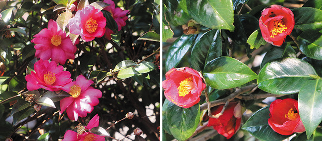 ▲ 애기동백꽃 (왼쪽)은 주로 분홍색을 띠고 활짝 벌어져 있어요. 진한 붉은색에 살짝만 벌어지는 동백꽃 (오른쪽)과 구분된답니다. / 김민철 기자
