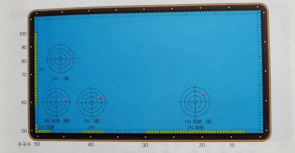 예를 들면, 수구 60 출발 시 3 쿠션 값이 19 라면 1 시 30 분 3 팁, 3 쿠션 값이 30 이라면 2 시 3 팁, 3 쿠션 값이 40 ~ 50 이라면 2 시 30 분 3 팁, 3 쿠션 값이 60 이라면 3시 3 팁 당점을 준다.
