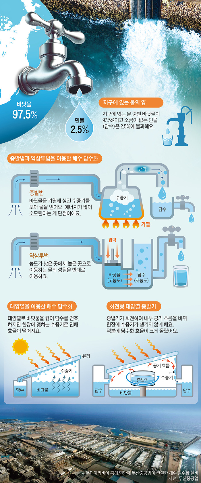 바닷물을 어떻게 민물로 바꿀 수 있을까요? 해수 담수화 기술은 크게 '증발법' 과 '역삼투법' 두 가지가 있답니다.