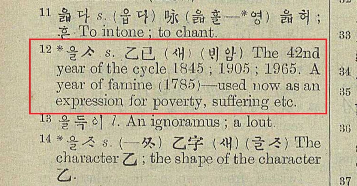 ‘乙 새 巳 배암(뱀) 60갑자의 42번째 해 1845 ; 1905 ; 1965. 기근이 난 해 (1785) - 지금은 가난과 고통 등을 뜻하는 표현.’ (The 42nd year of the cycle 1845; 1905; 1965. A year of famine(1785) - used now as an expression for poverty, suffering etc)