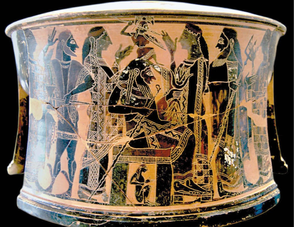 기원전 6세기 그리스에서 제작된 도자기에 그려진 그림. 제우스 (가운데)의 머리에서 아테나가 튀어나오는 장면을 그렸습니다. / 위키피디아