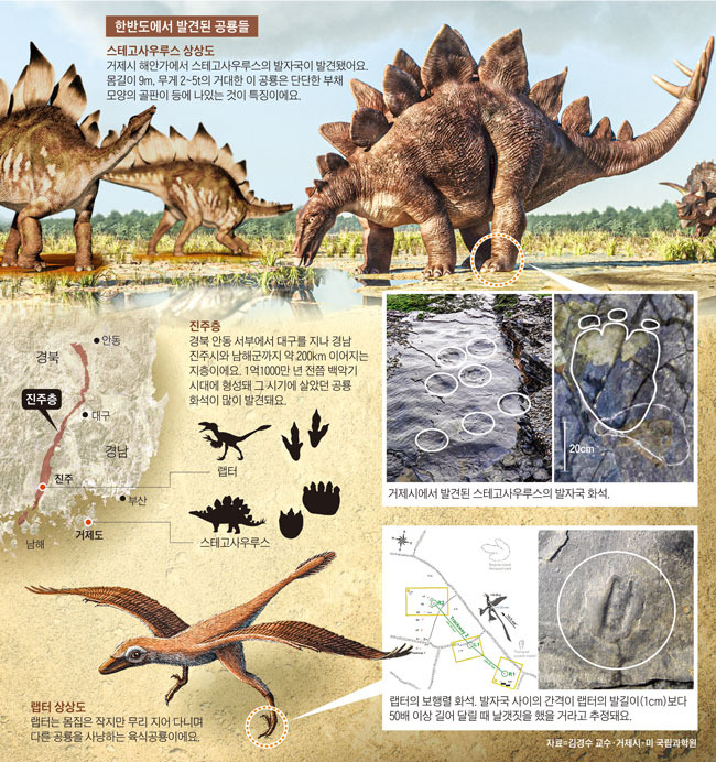 이처럼 우리나라 남쪽 지역에선 공룡 발자국 화석이 많이 발견돼요. 전남 해남군 우항리에선 익룡 발자국이 발견됐고, 전남 보성군에선 백악기에 한반도에 살았던 '토종 공룡' 코리아노사우루스 화석이 발견됐죠. 이번에 스테고사우루스가 발견된 거제 지역에서도 여러 종류의 공룡 발자국 화석이 함께 발견됐지요. 발자국 크기가 20㎝부터 40㎝까지 다양해요. 과학자들이 분석한 결과 몸집이 크고 목이 기다란 용각류 공룡과 익룡, 그리고 거북 발자국도 있었어요. 백악기 시대 한반도 지역에 다양한 생물이 살았다는 것을 알 수 있답니다.