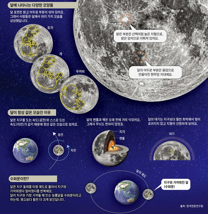 지난주 추석 연휴, 밤하늘을 올려다봤나요? 흐린 날씨 때문에 아쉬웠지만, 일부 지역에선 커다랗고 둥근 달이 환하게 뜬 모습을 봤을 거예요. 보통 둥근 달이 떴을 때 자세히 들여다보면 얼룩덜룩한 무늬가 보인답니다. 어떤 사람은 그게 두꺼비처럼 생겼다고 하고, 또 어떤 사람은 떡방아 찧는 토끼라고 말하죠. 도대체 무늬의 정체는 뭘까요? 오늘은 달 모양에 담긴 과학적 비밀에 대해 알아보도록 해요.