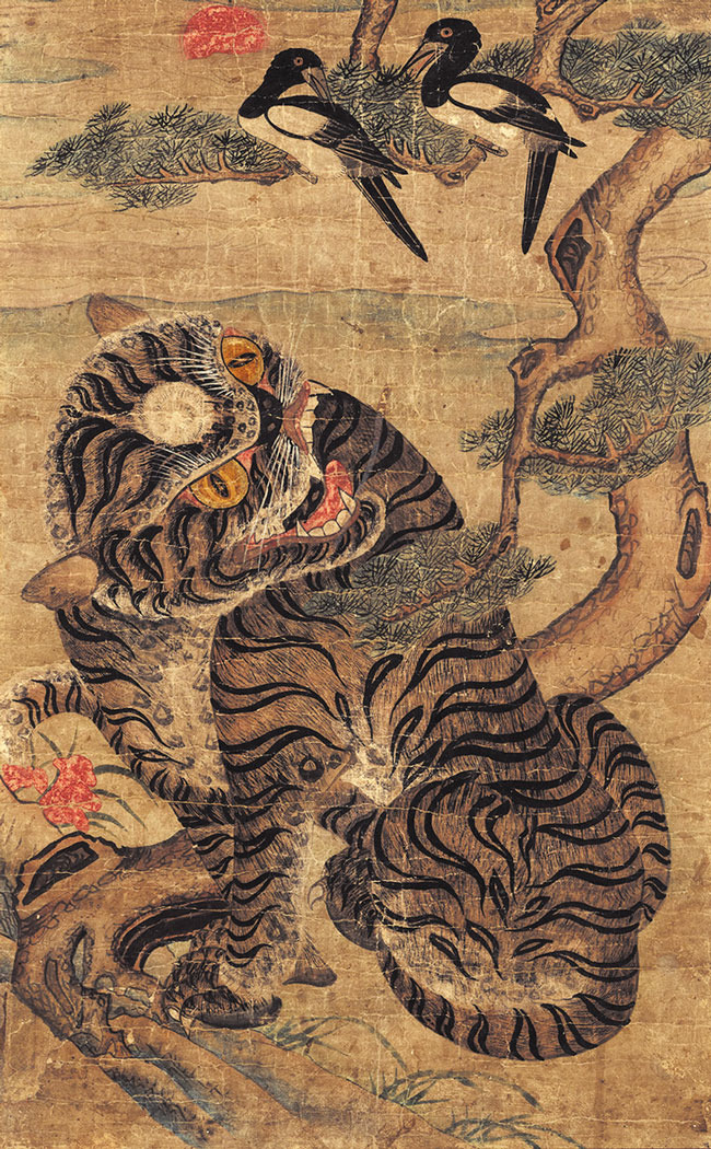 ▲ 작품2 ㅡ 호랑이와 까치를 그린 '호작도' (19세기 추정). 종이에 채색. 조선 후기 널리 그린 대표적 민화로, 나쁜 기운은 물러가고 좋은 일이 오길 바라는 백성들의 소망을 담았어요. / 아모레퍼시픽미술관
