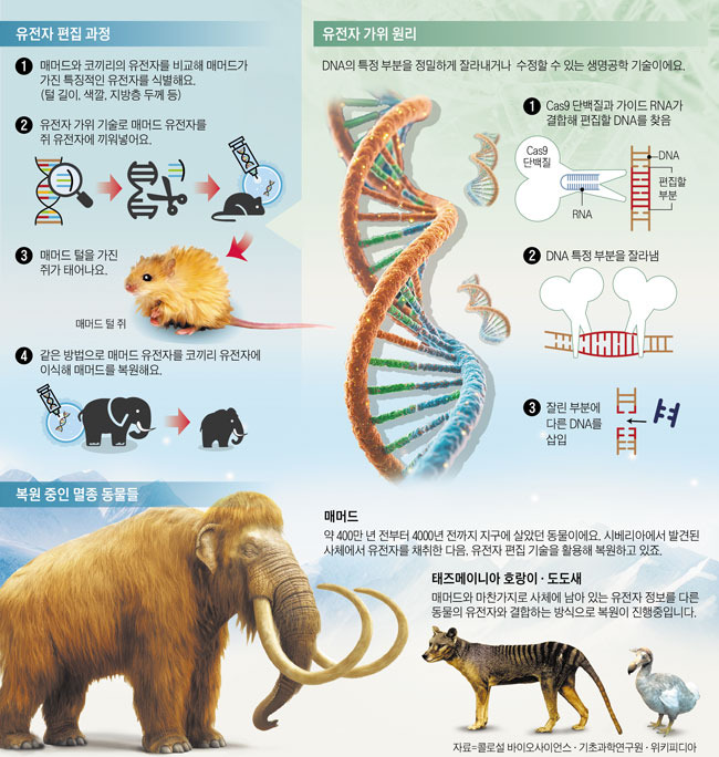 하지만 이 털북숭이 쥐는 우연히 나타난 것은 아니에요. 미국 생명과학 기업 '콜로설 바이오사이언스' 가 유전자 편집 기술을 이용해 매머드 특성을 갖고 있는 쥐를 만들어낸 것이죠. 이 기업은 앞으로 실제 매머드를 복원하는 것이 목표랍니다. 이미 사라진 동물들을 어떻게 되살릴 수 있는 걸까요?