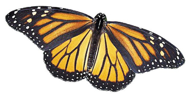 두 날개를 활짝 펼친 너비는 최장 10㎝이고, 몸무게는 0.7g에 불과한 이 나비는 어지간한 새들도 쉽게 엄두를 내지 못하는 장거리 비행 능력으로 유명하답니다. 철새처럼 겨울 추위를 피해 미국 · 캐나다에서 멕시코를 오가면서 살아가는데 왕복 비행 거리가 5000㎞에 육박하거든요. 제왕나비는 언뜻 보면 호랑나비랑도 비슷해요. 노란빛이 도는 주황색 바탕에 검은 줄무늬가 있고, 날개 테두리에는 검은색에 흰 점무늬가 박혀 있지요. 이 무늬는 다른 새나 곤충에게 "내 몸엔 독이 있으니 먹지 마!" 라고 알리는 경고 무늬예요.
