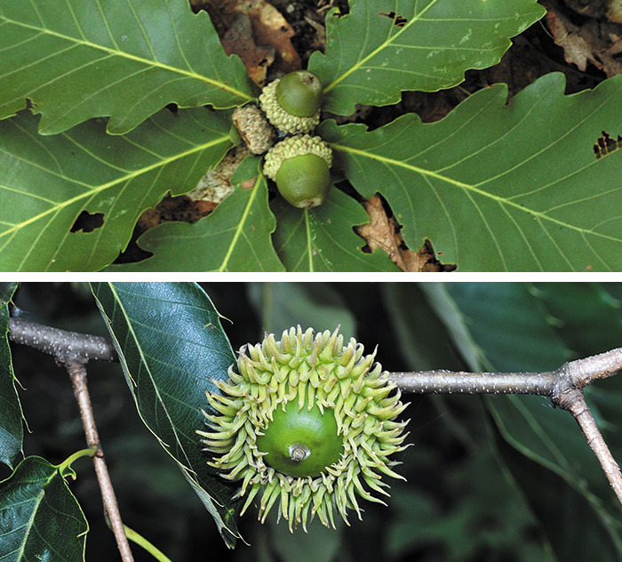 ▲ 동물들의 겨울 식량이 되는 도토리는 참나무 종류마다 모양이 조금씩 달라요. 위쪽은 신갈나무, 아래쪽은 굴참나무의 도토리예요. / 국립생물자원관 · 국립수목원
