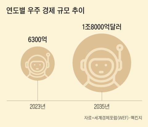 하지만 아무리 험난해도 오늘날 인류는 우주로 향한다. 대항해 시대 유럽인들이 각종 금은보화와 향신료를 싣고 돌아와 부를 일구려는 꿈에 대양으로 범선을 띄운 것처럼 오늘날 우주 개발은 성공만 하면 ‘잭팟’ 을 터뜨릴 것으로 예상되기 때문이다. 특히 소행성엔 희토류, 헬륨-3 등 희귀 광물이 풍부한 것으로 알려졌다. 채드 앤더슨 미국 스페이스 캐피털 CEO는 저서 ‘스페이스 이코노미’에서 우주 경제의 신흥 산업으로 ‘우주 정거장’ ‘달 산업’ ‘우주 물류업’ ‘우주 중공업’ 등을 꼽았다. 우주에서 귀한 광물을 실어 나르고 우주 호텔에 머물며 달 관광을 하는 시대가 도래하면 관련 산업이 폭발적인 성장을 할 것이란 예견이다. 세계경제포럼 (WEF)은 지난해 우주 통신, 위성 제조 등 우주 산업과 관련한 경제 규모가 약 6300억달러 (약 880조원)에 달하며, 2035년엔 그 규모가 1조8000억달러까지 늘어날 것으로 내다봤다. 제러미 제건스 세계경제포럼 전무이사는 “우주에서의 인간 활동은 전례 없는 속도로 가속화하고 있다” 며 우주로 향하는 인류의 여정이 순항할 것으로 내다봤다.