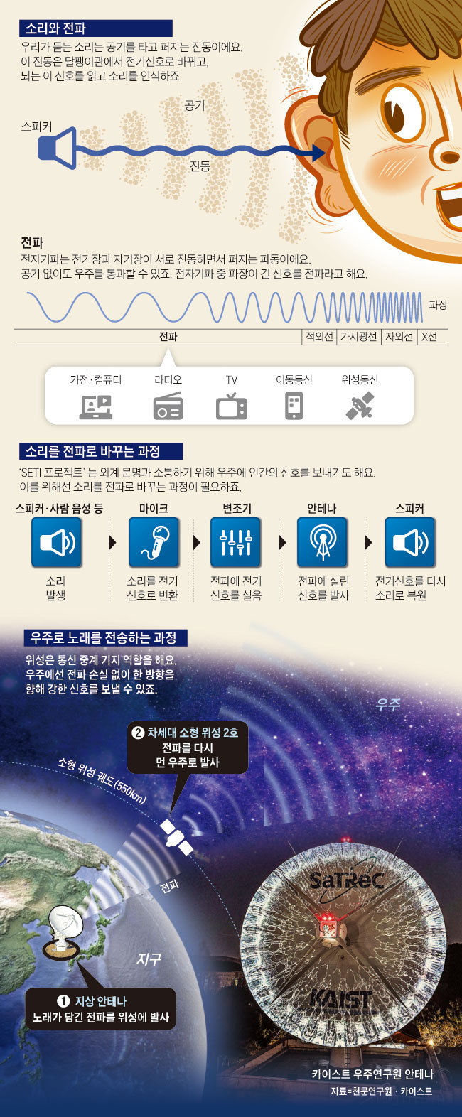 소리를 전파로 바꿔 우주로 보내요