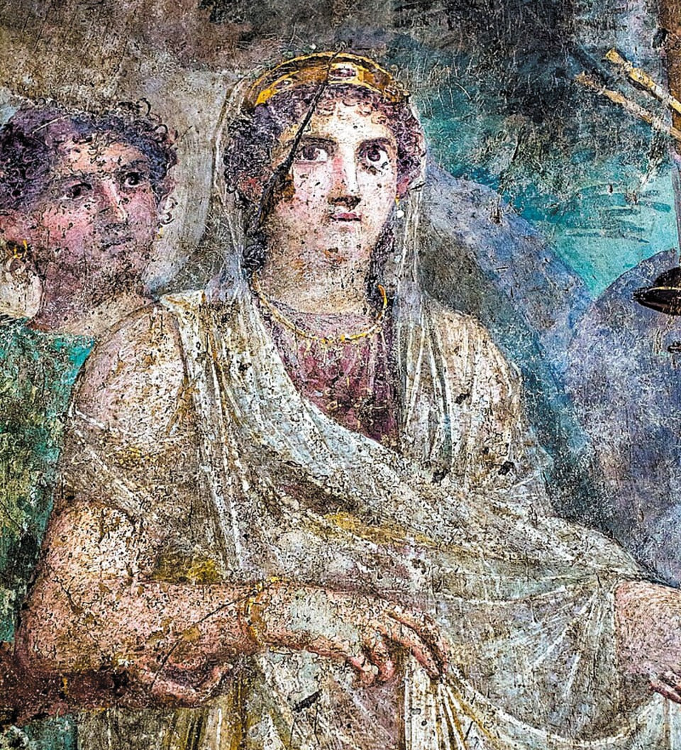 고대 로마의 도시 폼페이에서 발견된 프레스코화. 유노 (헤라 · 가운데)로 추정되는 인물이 묘사돼 있어요. 로마 신화에선 유노는 출산을 돕는 신으로 여겨집니다. / 위키피디아