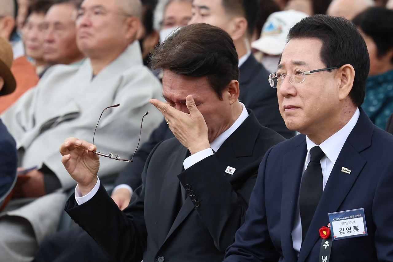 추념식에서 눈물 흘리는 총리 김민석. / 연합뉴스