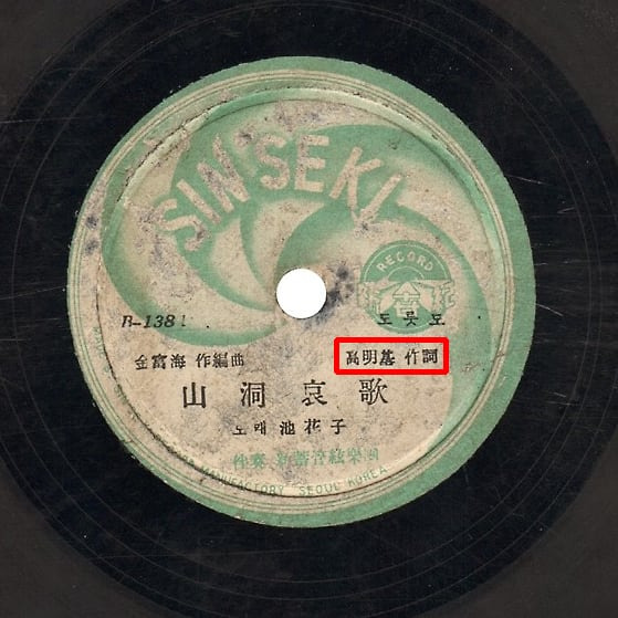 여기에는 산동애가가 작사 ‘鄭性壽 (정성수)’, 작편곡 金富海 (김부해), 노래 池花子 (지화자)로 기록돼 있다. 논문은 이 鄭性壽가 토벌 작전에 참여했던 전북 경찰국 소속 경찰이라고 주장했다.