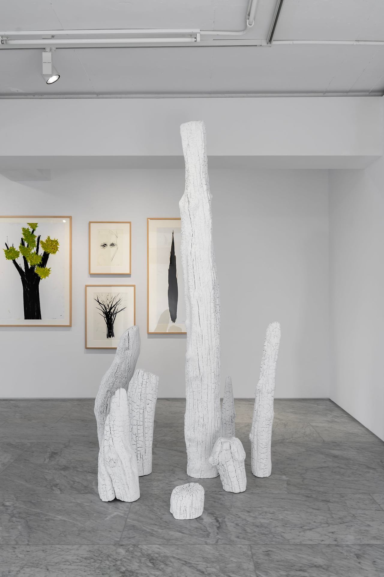2019년 강원도 산불로 타버린 나무를 다시 태워 만든 신작 '무제' (2025). 고열에 태운 나무를 하얗게 분칠해 전시장에 내놨다. / PKM 갤러리