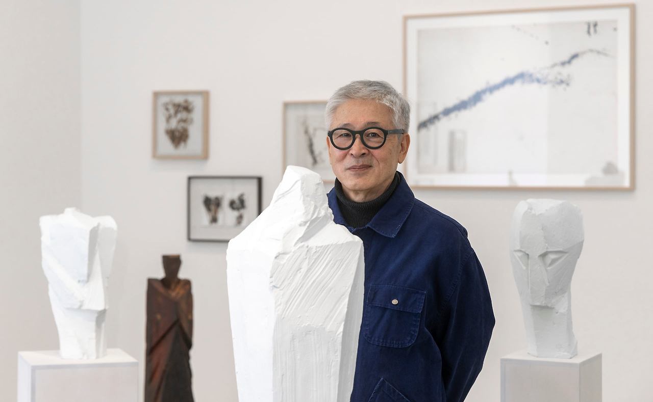 조각가 정현이 서울 삼청동 PKM 갤러리 전시 작품 뒤에 서 있다. / 김지호 기자
