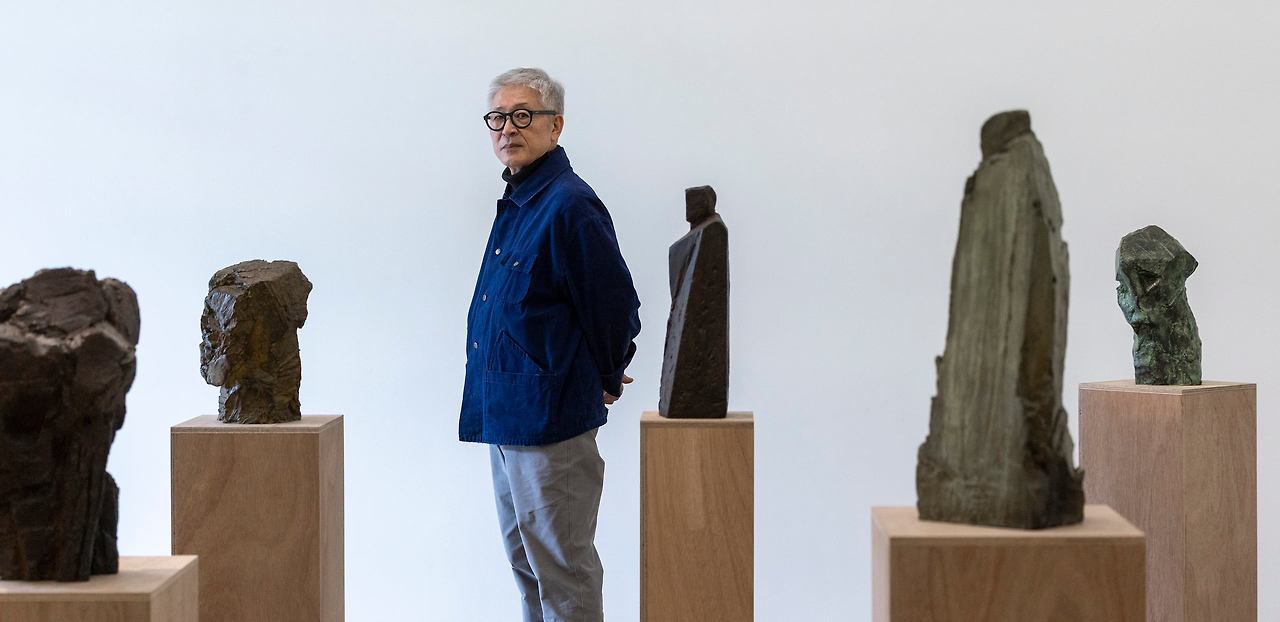 조각가 정현이 서울 삼청동 PKM 갤러리에서 1990년대 ~ 2000년대 초반 브론즈 조각 사이에 서 있다. 삽과 각목으로 내리쳐 압착한 투박한 인간 형상에 고뇌하는 얼굴, 서 있는 남자가 보인다. / 김지호 기자
