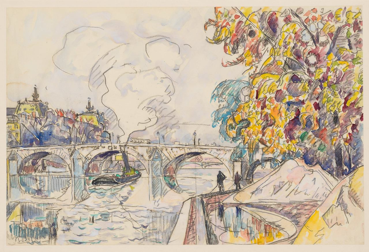 ④ 폴 시냐크, '파리 : 루아얄 다리와 오르세 기차역'. 1929 ~ 1930년경. 종이에 검은 크레용과 수채. 28.8 × 43.3cm.