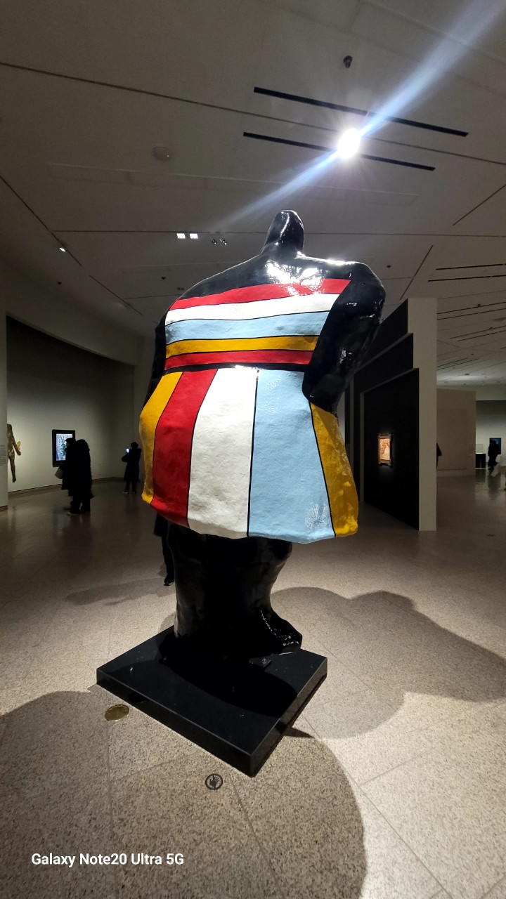 <검은 나나 (라라)> (1967)는 부푼 가슴과 배, 원색의 밝고 강렬한 무늬의 드레스 등 '나나' 연작 특유의 모습을 갖추고 있다. 작가는 친구의 임신에 영감을 받아 풍만한 몸매를 가진 '나나' 연작을 시작하였고, 동적인 형태의 곡선과 강렬한 색채를 사용해 생명력이 넘치는 유쾌한 여성성을 표현했다. 날씬한 몸매로 묘사되어 왔던 일반적인 여성 표현과 다른 역동적인 자세의 거대한 여인상은 원초적 힘과 자유로움으로 사회적 통념을 비웃는다.