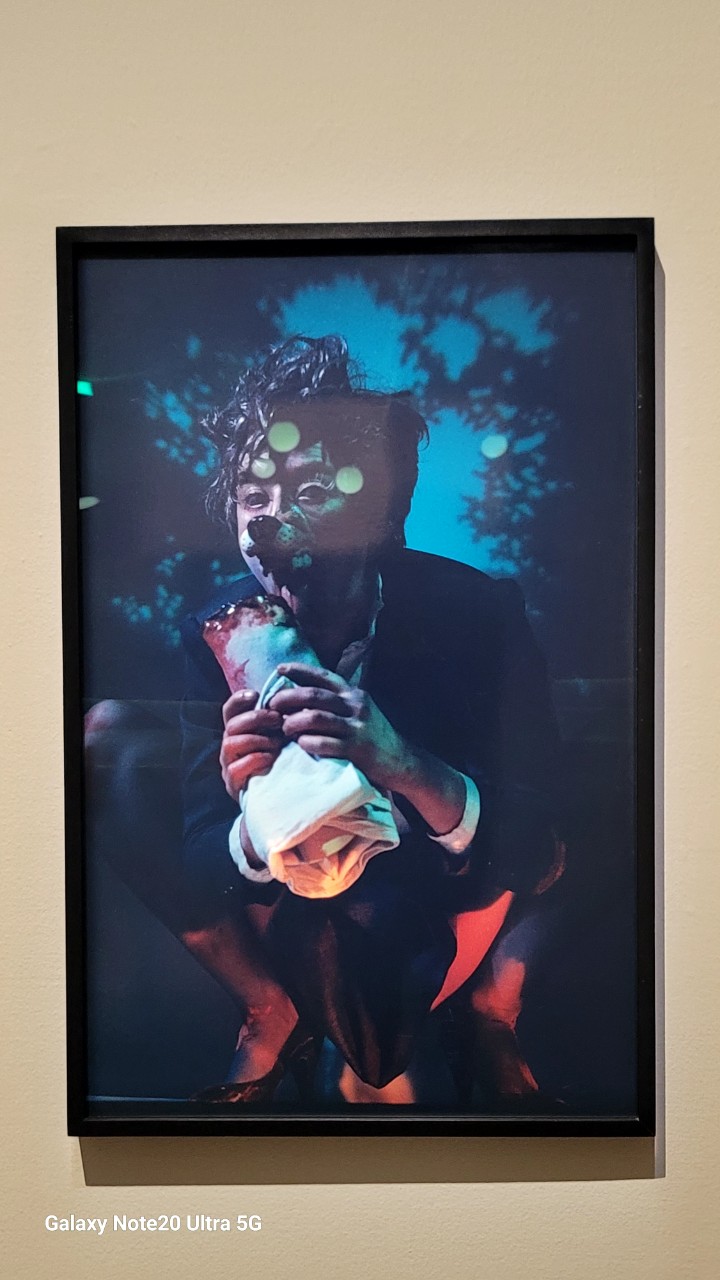 <무제 163> (1987)는 1980년대 후반 적극적으로 시도된 극적인 연추과 신화적 정체성을 보여주는 작품이다. 화면에는 짐승의 입을 탈차럼 쓴 인물이 하이힐을 신고 쪼그려 앉아 피 묻은 무엇인가를 뜯어 먹고 있다. 인물의 연극적이고 과장된 모습은 동화나 신화 속 장면을 연상하게 하지만 전통 동화의 순수함과 희망을 비틀어 공포, 죽음 등 그로테스크 (Grotesque)한 방식으로 긴장과 불안을 유발한다. 셔먼은 여성의 이상적인 미와 대비되는 추하고 역겨운 이미지를 통해 사회적 고정관념으로 인해 불안한 여성의 심리를 초현실적으로 표현한다.