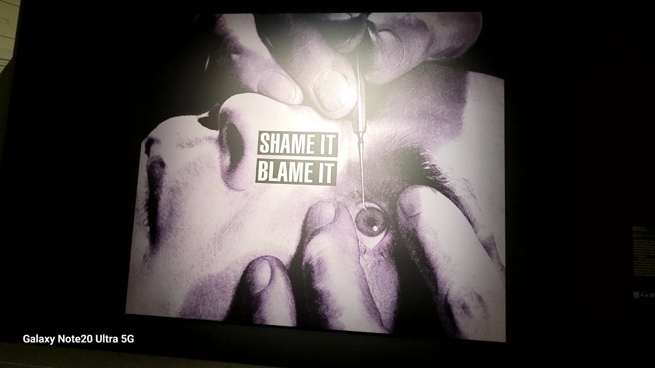 <모욕하라, 비난하라> (2010)는 이미지와 텍스트를 결합하는 바바라 크루거 특유의 작업방식을 보여주는 대표작으로 매우 강렬한 시각적 인상을 주는 작품이다. 날카로운 바늘이 눈을 찌르려는 순간을 담은 이미지 위에 '모욕하라 비난하라 (Shame it, Blame it)' 라는 문장을 배치해 미디어와 시각적 이미지가 개인에게 가하는 위협과 폭력을 표현한다. 다양한 해석의 가능성을 갖는 크루거의 문장들은 온전한 진실과 고정관념에 대해 근본적인 질문을 던지게 한다.
