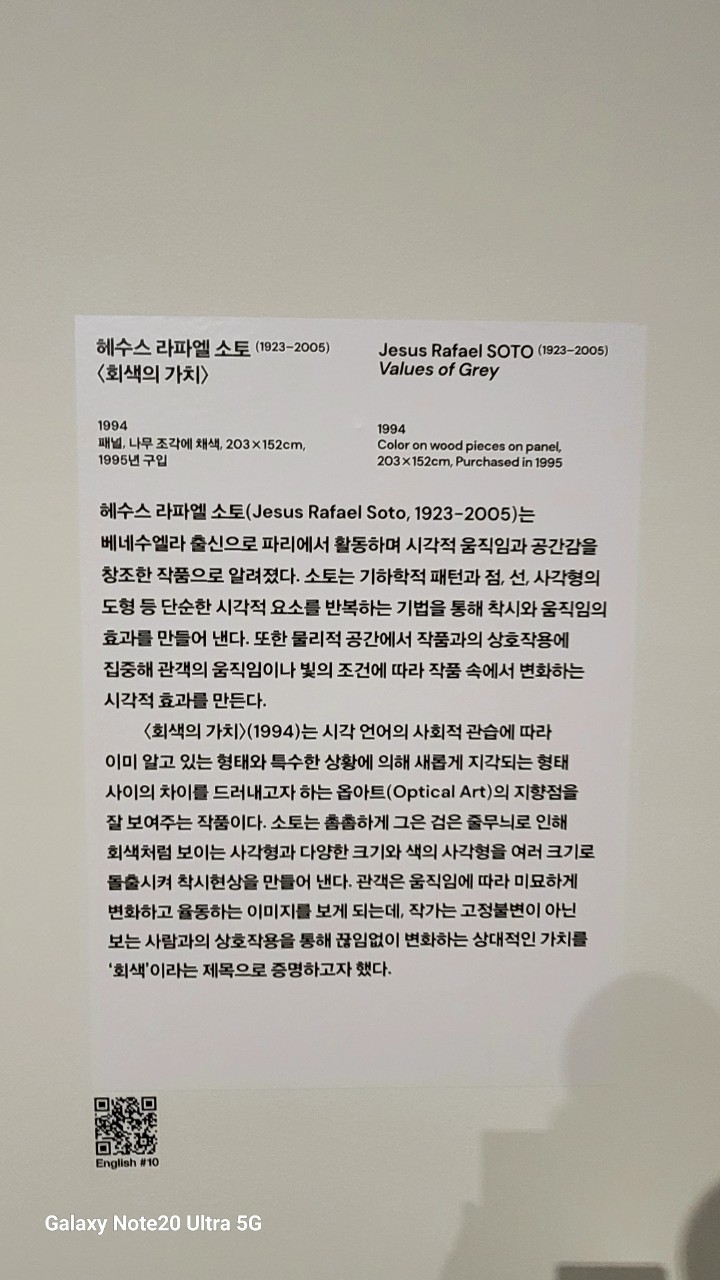 <회색의 가치> (1994)는 시각 언어의 사회적 관습에 따라 이미 알고 있는 형태와 특수한 상황에 의해 새롭게 지각되는 형태 사이의 차이를 드러내고자 하는 옯아트 (Optical Art)의 지향점을 잘 보여주는 작품이다. 소토는 촘촘하게 그은 검은 줄무늬로 인해 회색처럼 보이는 사각형과 다양한 크기와 색의 사각형을 여러 크기로 돌출시켜 착시현상을 만들어낸다. 관객은 움직임에 따라 미묘하게 변화하고 율동하는 이미지를 보게 되는데, 작가는 고정불변이 아닌 보는 사람과의 상호작용을 통해 끊임없이 변화하는 상대적인 가치를 '회색' 이라는 제목으로 증명하고자 했다.