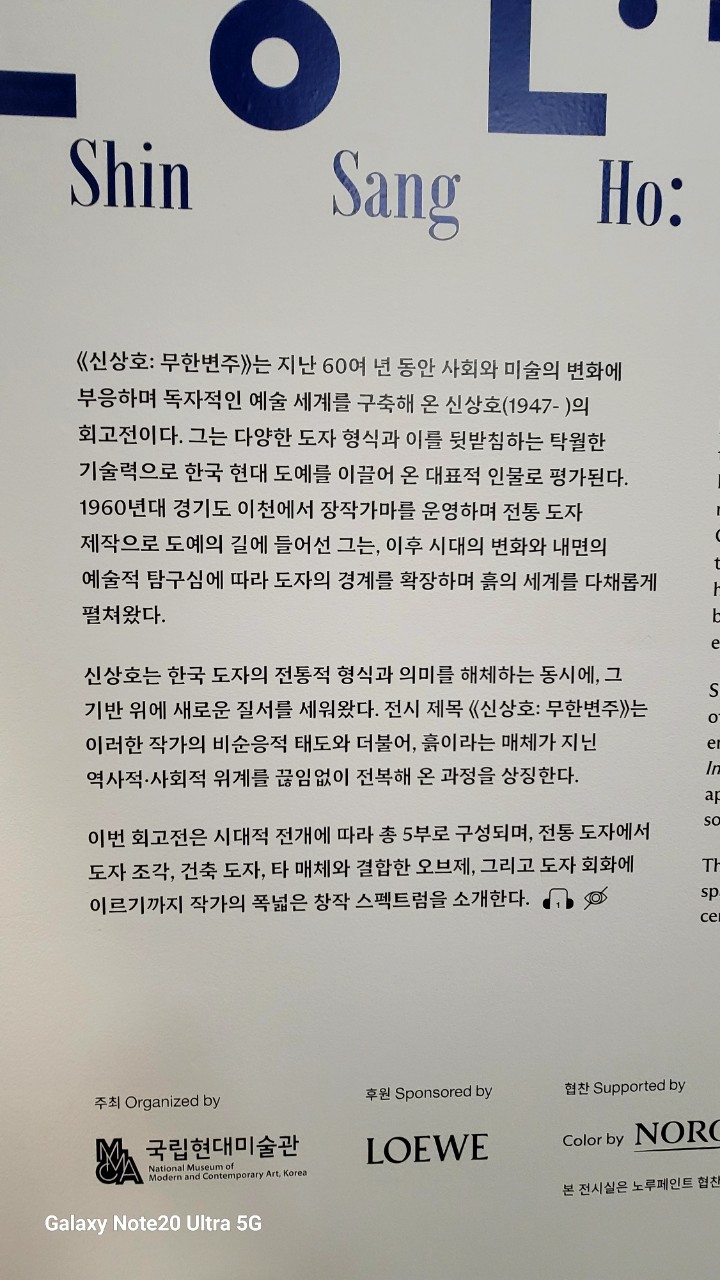 신상호는 한국 도자의 전통적 형식과 의미를 해체하는 동시에, 그 기반 위에 새로운 질서를 세워왔다. 전시 제목 《신상호 : 무한변주》는 이러한 작가의 비순응적 태도와 더불어, 흙이라는 매체가 지닌 역사적 · 사회적 위계를 끊임없이 전복해 온 과정을 상징한다.