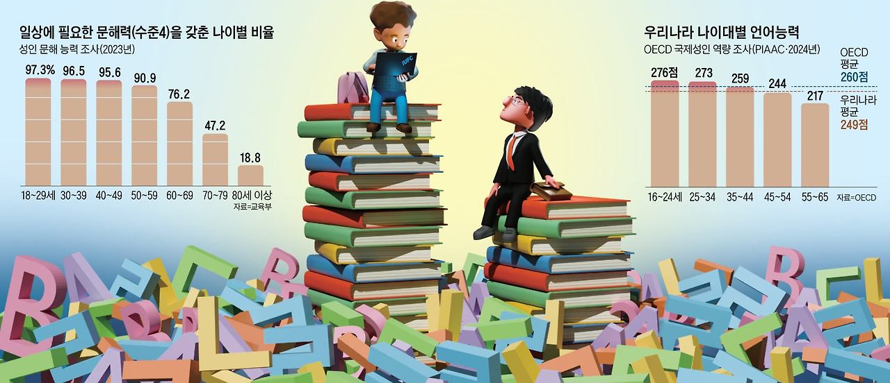 교육부가 2023년 실시한 제4차 성인 문해 능력 조사에 따르면 일상에 필요한 문해력을 갖춘 비율은 18 ~ 29세는 97.3%였지만 50대 90.9%, 60대 76.2%, 70대 47.2%로 세대가 올라갈수록 급격히 떨어진다. 외국 기관의 평가도 같은 결과를 보여준다. 2024년 경제협력개발기구 (OECD)의 국제성인 역량 조사 (PIAAC)에서 우리나라 성인의 언어 능력은 OECD 평균에 못 미치지만, 16 ~ 24세는 OECD 평균을 넘어선다. 아이들은 더 뛰어나다. 2022년 OECD가 81개국 15세 학생들을 대상으로 한 국제학업성취도평가 (PISA)에서 우리나라는 읽기 영역에서 세계 4위로 최상위권이었다.