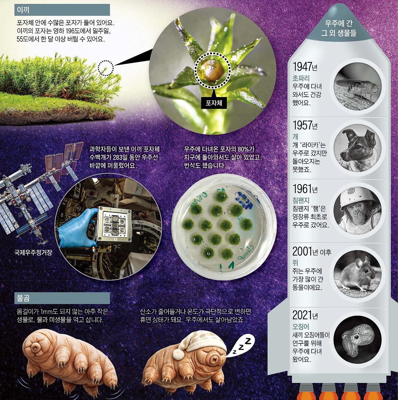지구에서 가장 강한 생명체는 무엇일까요? 동물의 왕으로 불리는 사자, 지구에서 몸집이 가장 큰 대왕고래··· 그런데 최근 지구 최강 생명체로 이끼가 주목받고 있습니다. 우주에서 9개월 동안 지내다가 지구로 살아 돌아온 이끼에 대한 연구가 지난달 한 국제 학술지에 발표됐거든요. 오늘은 우주의 극한 환경을 버텨낸 이끼와 우주에 다녀온 다른 생물들의 이야기를 해보겠습니다.
