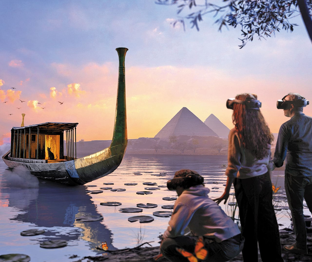 사진4 - '쿠푸 왕의 피라미드' 전시에서 VR 기기를 착용한 관람자들이 고대 이집트 배를 타고 사원으로 가는 체험을 하는 가상 이미지. / Excurio