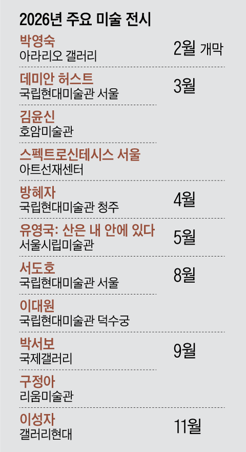 2026년 미술계는 ‘K 거장’ 을 전면에 내세웠다. 유영국 · 이대원 · 박서보 등 근현대 거장들부터 서도호 · 구정아 등 동시대 글로벌 스타까지 한국 작가들의 굵직한 개인전이 어느 해보다 많이 열린다. 김윤신 · 박영숙 · 이성자 등 1세대 여성 작가들도 활발하게 재조명한다. 해외 작가 중엔 영국 현대 미술가 데미안 허스트의 아시아 첫 대규모 회고전이 단연 눈에 띈다.