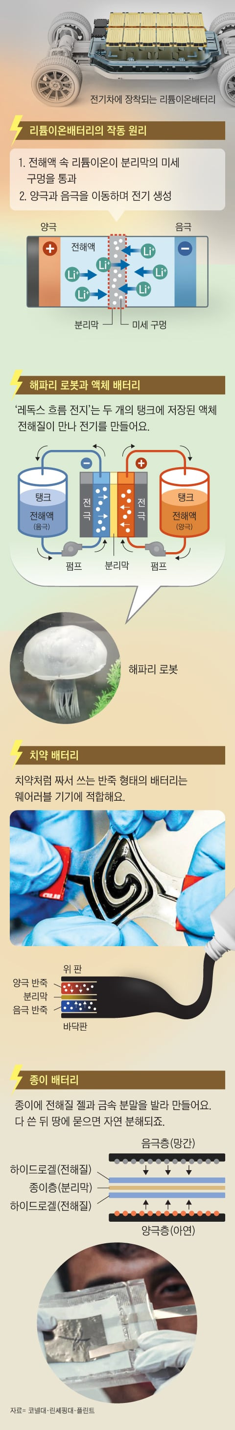 도로 위에서 조용히 달리는 전기차, 요즘은 정말 자주 만날 수 있지요? 전기차처럼 전기를 사용해 작동하는 기기는 우리 일상에 점점 더 많아지고 있는데요. 최근엔 옷처럼 입는 웨어러블 기기, 물속을 유영하는 로봇처럼 다양한 전자기기가 등장하며 배터리도 새로운 모양으로 진화하고 있답니다. 과학자들은 물처럼 흐르고, 땅에서 썩는 배터리도 개발했어요. 오늘은 다양한 형태로 발전하고 있는 배터리에 대해 알아보겠습니다.