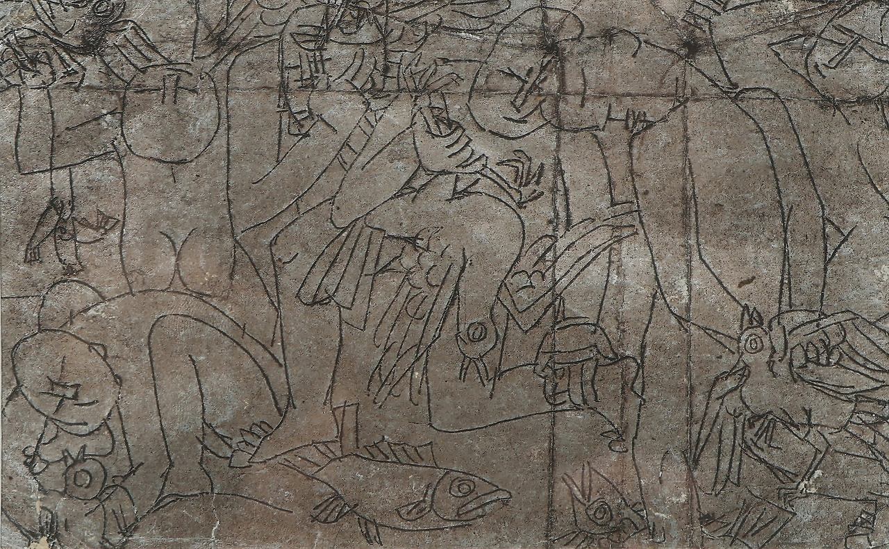 이중섭, 은지화 '가족1' (연도 미상). 은지에 새김, 10 × 14cm. / 개인 소장