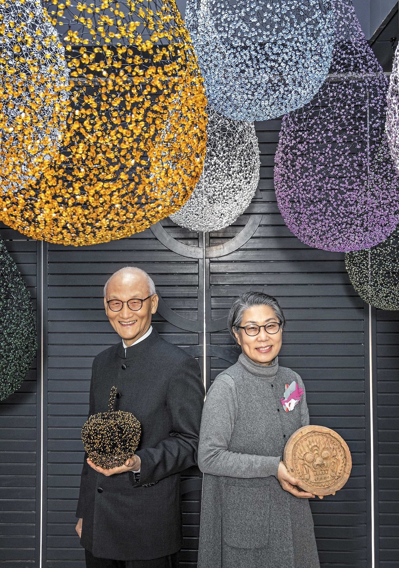 지난 2022년 본지 인터뷰 때 만난 ‘기와 검사’ 유창종 (왼쪽)과 금기숙 작가. 서울 부암동 유금와당박물관 정문 앞에서 활짝 웃고 있다. 남편은 아내의 작품을, 아내는 와당 수집품을 들었다. 천장에 매달린 설치물은 금 작가의 작품이다. / 이신영 영상미디어 기자