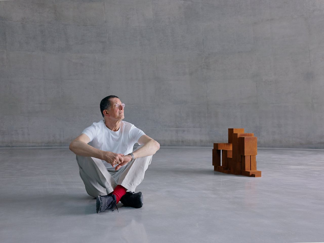 자신의 첫 상설 전시관 ‘Ground’ 에 앉은 조각가 앤터니 곰리. 그는 “공간과 작품이 함께 성장하는 경험을 처음 하게 됐다” 고 했다. 옆엔 무릎을 모으고 뒤로 기댄 사람 모습을 표현한 그의 조각. / 뮤지엄 산