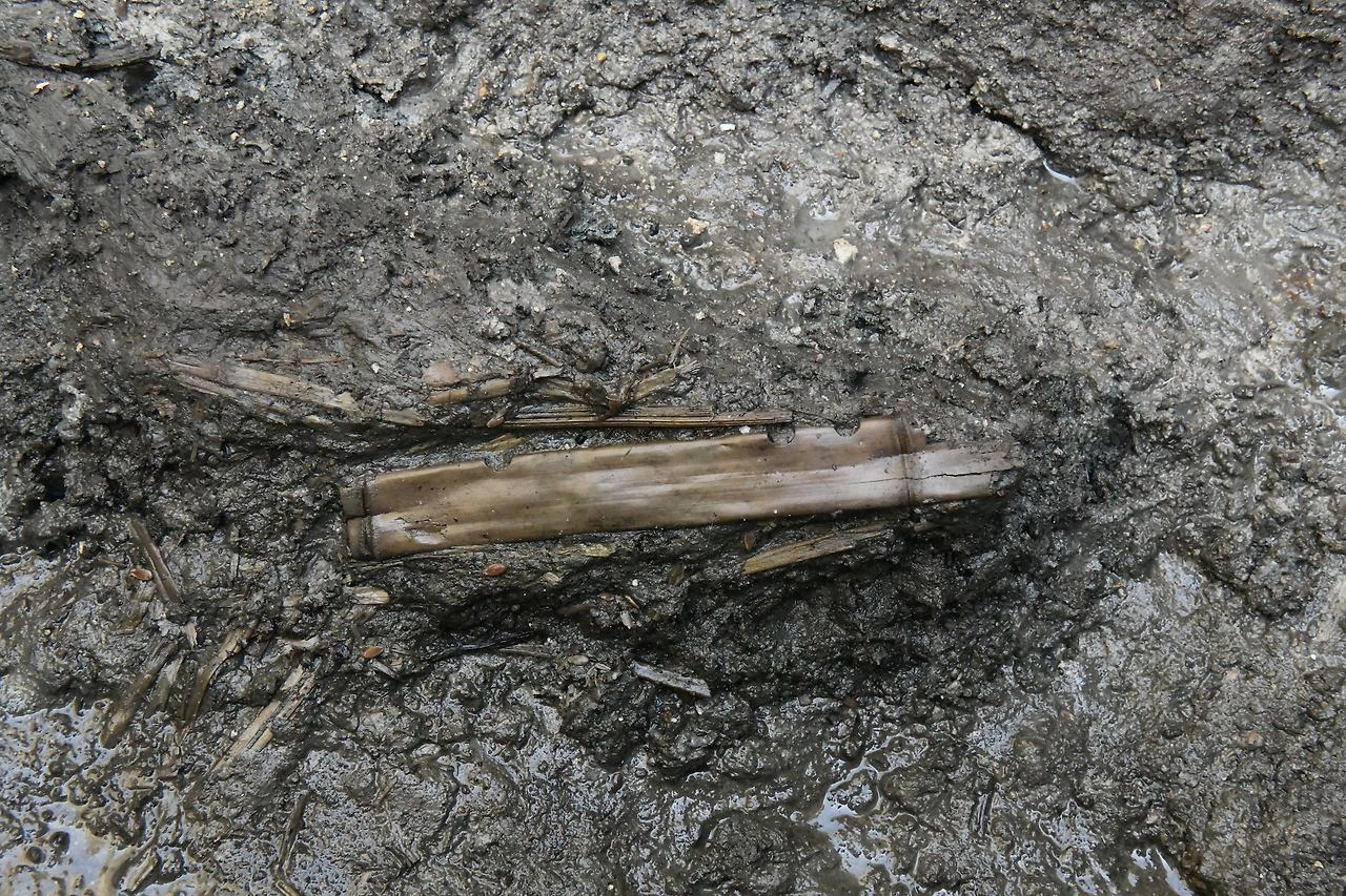 부여 관북리 유적의 구덩이 바닥에서 드러난 백제 관악기 횡적. 부러진 채 납작하게 눌린 상태로 발견됐다. / 국립부여문화유산연구소
