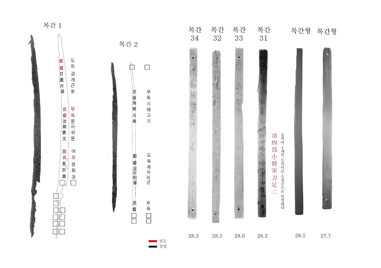 예를 들어 길이 28.3㎝에 달하는 목간에는 ‘공적이 4개인 도족이를 소장군으로 삼다 (功四爲小將軍刀足二)’ 라고 적혀 있어 인사 관련 문서로 해석된다. 월 단위의 식량을 기록한 장부 목간, 사비 도성의 중앙 행정 구역인 5부 (部), 6세기 지방 행정 체계의 재편 과정을 보여주는 목간도 다수 출토됐다.