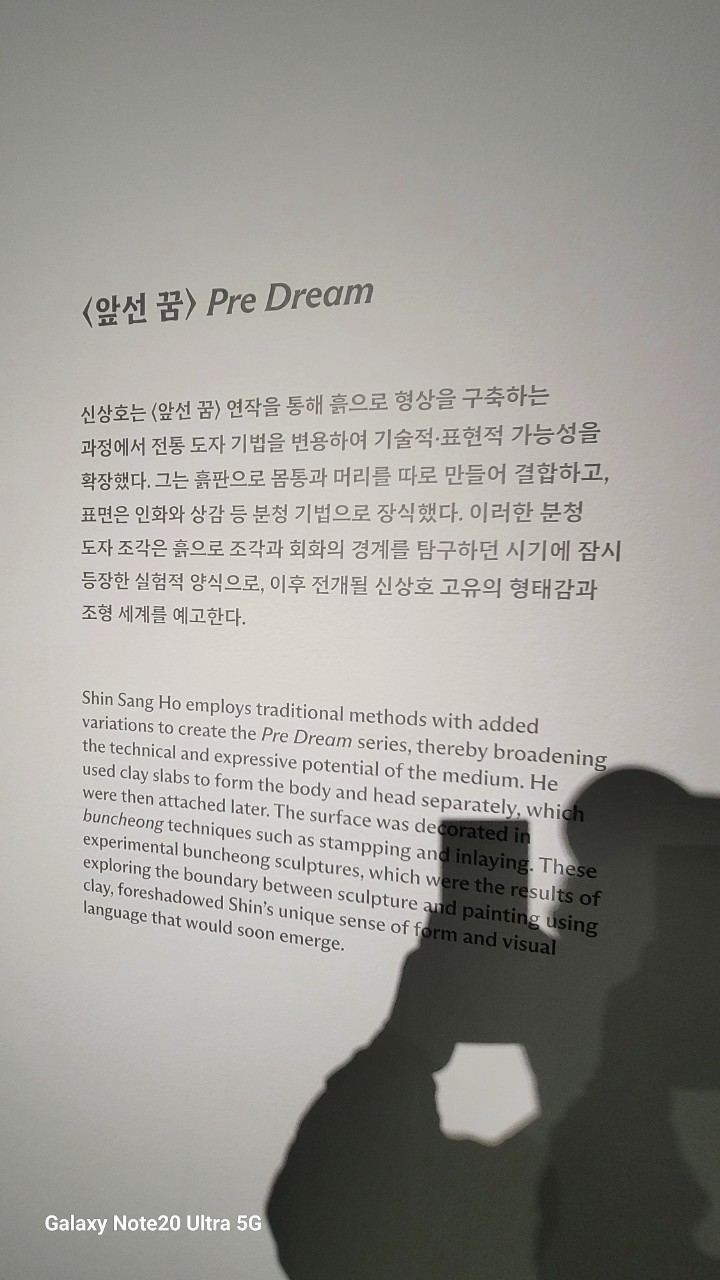 신상호는 <앞선 꿈> 연작을 통해 흙으로 형상을 구축하는 과정에서 전통 도자 기법을 변용하여 기술적 · 표현적 가능성을 확장했다. 그는 흙판으로 몸통과 머리를 따로 만들어 결합하고, 표면은 인화와 상감 등 분청 기법으로 장식했다. 이러한 분청도자 조각은 흙으로 조각과 회화의 경계를 탐구하던 시기에 잠시 등장한 실험적 양식으로, 이후 전개될 신상호 고유의 형태감과 조형세계를 예고한다.
