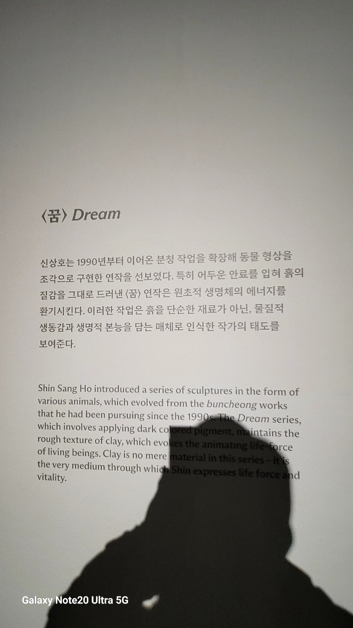 신상호는 1990년부터 이어온 분청작업을 확장해 동물 현상을 조각으로 구현한 연작을 선보였다. 특히 어두운 안료를 입혀 흙의 질감을 그대로 드러낸 <꿈> 연작은 원초적 생명체의 에너지를 환기시킨다. 이러한 작업은 흙을 단순한 재료가 아닌, 물질적 생동감과 생명적 본능을 담는 매체로 인식한 작가의 태도를 보여준다.