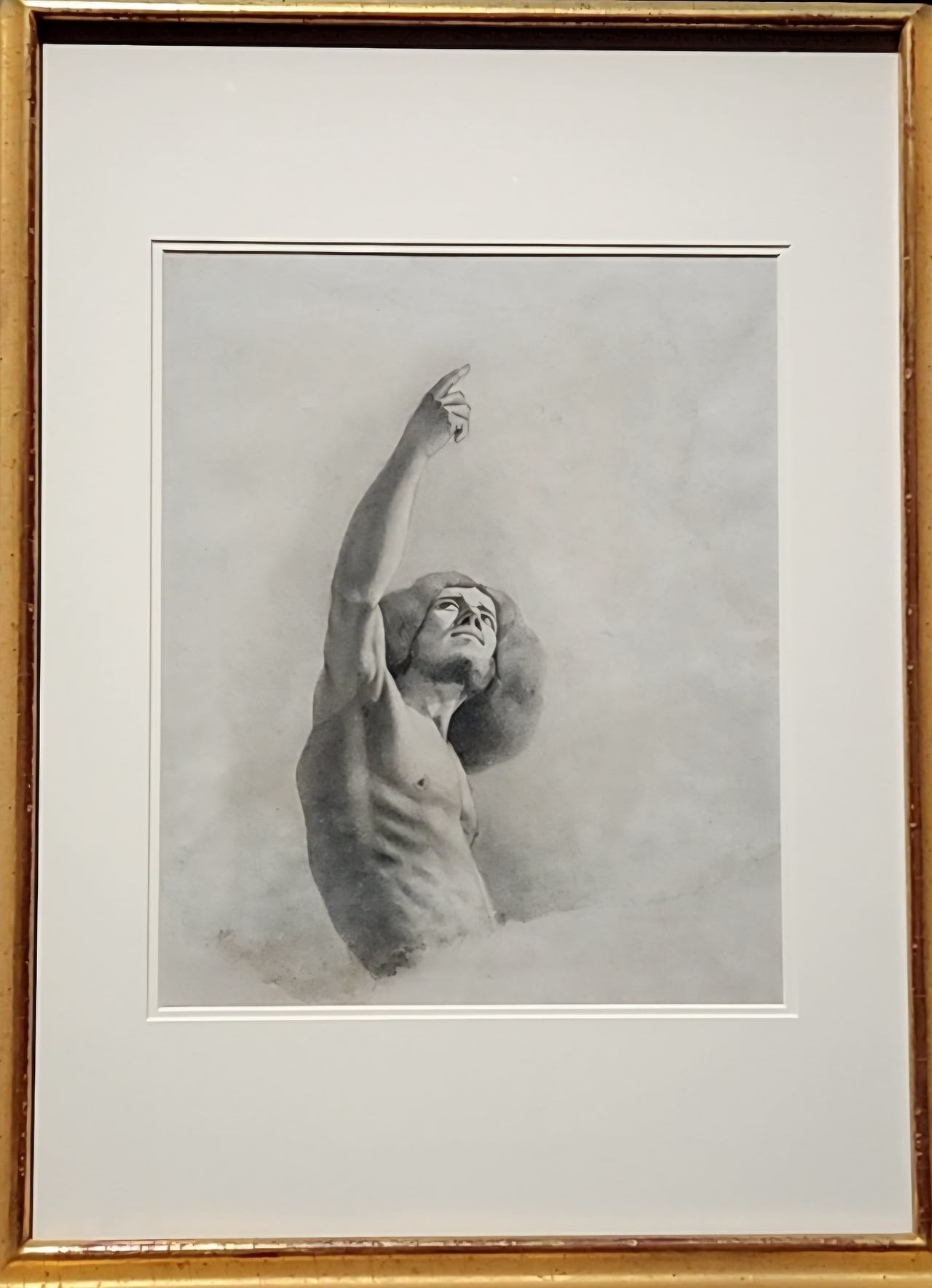 '팔을 들어 올린 남자' (1840년경). 구스타브 쿠르베 자화상으로 추정. 푸른빛 종이에 흑연, 검은색과 흰색 분필.