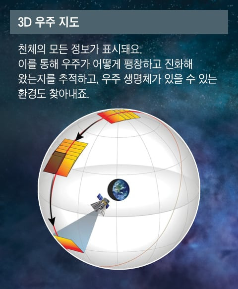 과학자들은 왜 3D 우주 지도를 만들려고 할까요? 과학자들은 이 지도를 통해 우주가 어떻게 시작돼 변화해 왔는지 연구하려고 해요. 약 138억 년 전 ‘하나의 점’ 에서 갑자기 우주가 터지듯 시작됐다는 ‘빅뱅 이론’ 을 설명하려는 거죠. 스피어엑스가 만드는 우주 지도를 통해 그 급팽창이 어떻게 일어났는지에 대한 단서를 얻으려는 거예요.