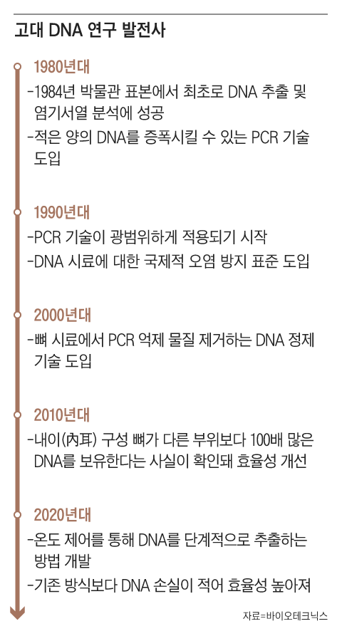 데니소바인의 얼굴을 찾아준 데는 40여 년에 걸쳐 발전해온 유전자 분석 기술이 기여했다. 고대 유전자에 대한 분석은 1984년 미국 캘리포니아대 연구팀이 멸종 동물 콰가얼룩말 표본에서 DNA를 추출하는 데 성공하면서 본격적으로 발달했다. 특히 유전자를 증폭시키는 기술로 PCR (중합효소 연쇄반응)이 등장하면서 관련 연구가 더욱 활기를 띠었다. 유전자의 특정 부위를 반복적으로 복제해 증폭함으로써, 소량의 DNA로도 정확한 분석이 가능해졌기 때문이다.