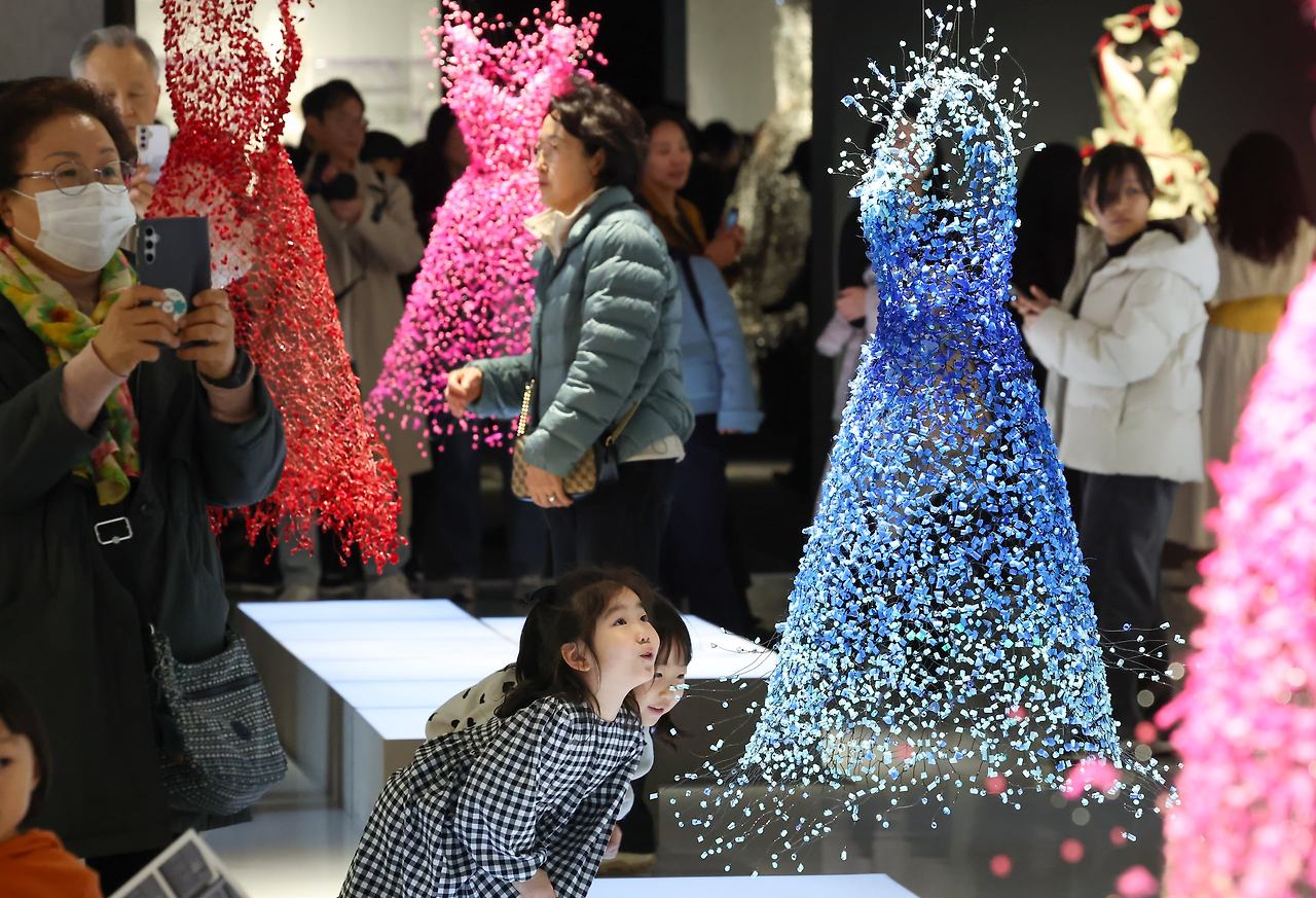 서울공예박물관에서 열리고 있는 ‘패션 아트의 선구자’ 금기숙 기증 특별전이 1일 누적 관람객 70만명을 돌파했다. 지금까지 국내에서 열린 단일 전시로 역대 최다 관람객 기록이다. 철사에 투명 비즈를 꿰고 엮어 한땀 한땀 빚은 ‘입는 조각’ 이 한국 전시 흥행 기록을 새로 쓴 것이다. 작년 12월 23일 개막해 70일 만에 달성한 수치로, 지난해 최고 흥행을 기록했던 국립현대미술관 서울관의 ‘론 뮤익’ 개인전이 총 94일간 53만3035명을 기록한 것과 비교해도 이례적인 속도다. 김수정 서울공예박물관장은 “하루 1만5000명, 주말엔 2만명까지 몰리고 있다” 고 했다.