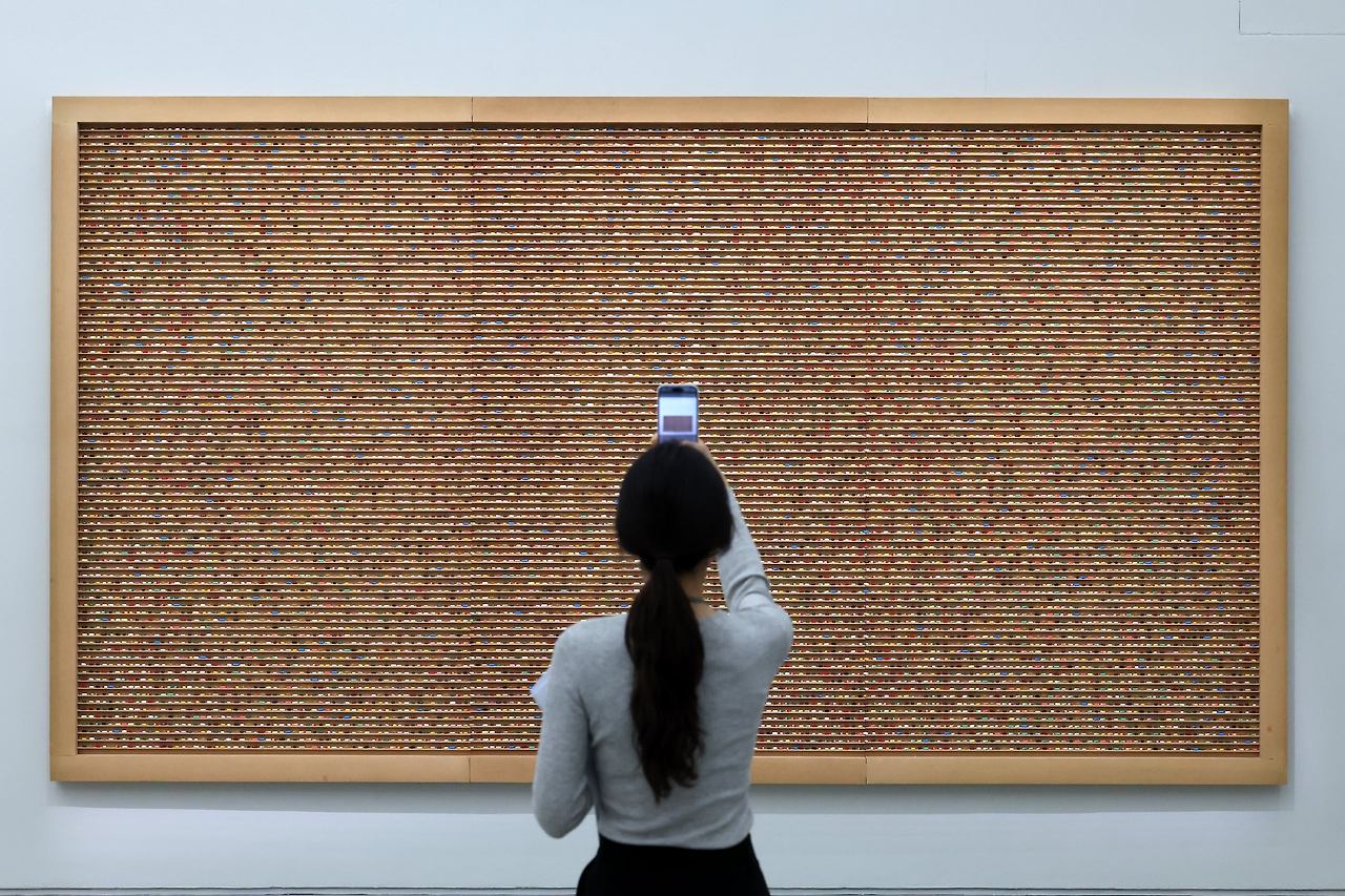 전시장에서 한 관계자가 알약이 빼곡하게 진열된 작품 '무한을 위한 원형' 을 촬영하고 있다. / 뉴시스