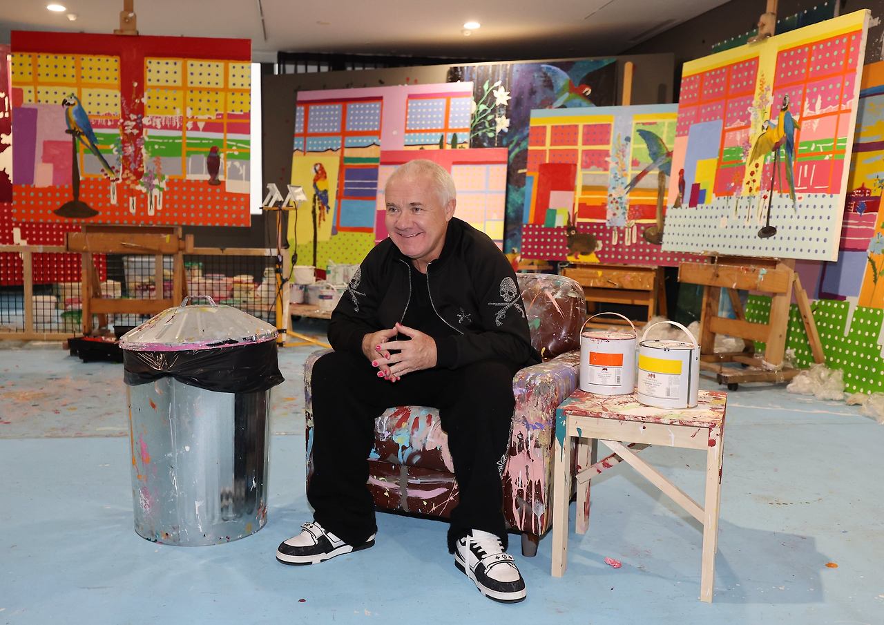 작가의 런던 작업실을 통째로 옮겨온 마지막 공간에서 데이미언 허스트가 물감 묻은 소파에 앉아있다. 작업 중인 미완성 회화들도 고스란히 공개됐다. / 연합뉴스