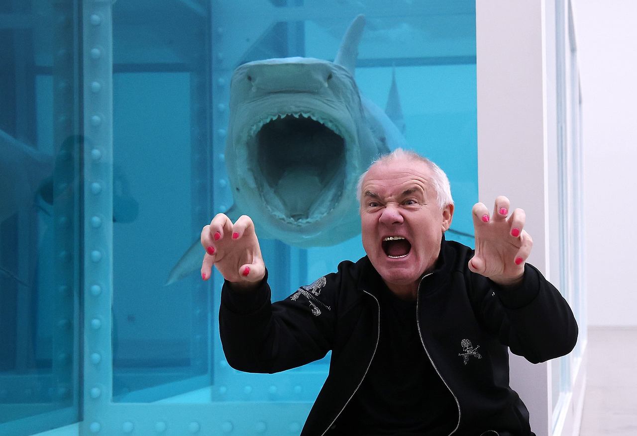 데이미언 허스트가 18일 서울 국립현대미술관 전시장에서 대표작 '살아있는 자의 마음 속 죽음의 물리적 불가능성' 앞에서 상어와 똑같은 표정을 짓고 있다. / 뉴스1