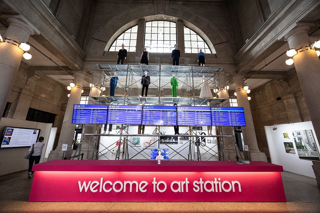 아시아 청년 작가들의 미술 축제 '아시아프' (~9월 7일)가 열리는 '문화역서울284 (옛 서울역)' 중앙홀은 이완 작가의 설치 작품 '표준시' (가운데)가 장식했다. 아시아프를 시작으로 전국 10여 곳에서 '대한민국 미술축제 2025' 가 이어진다. / 이경호 영상미디어 기자