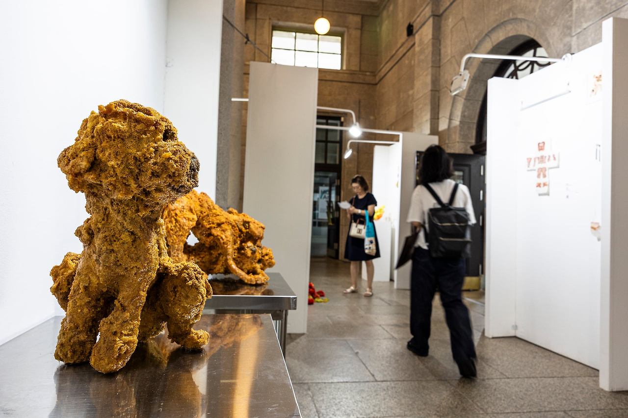 폴리염화비밀을 활용해 마치 프라이드 치킨과 같은 질감으로 반려동물을 표현한 권은산의 '이리이리'. / 이경호 영상미디어 기자